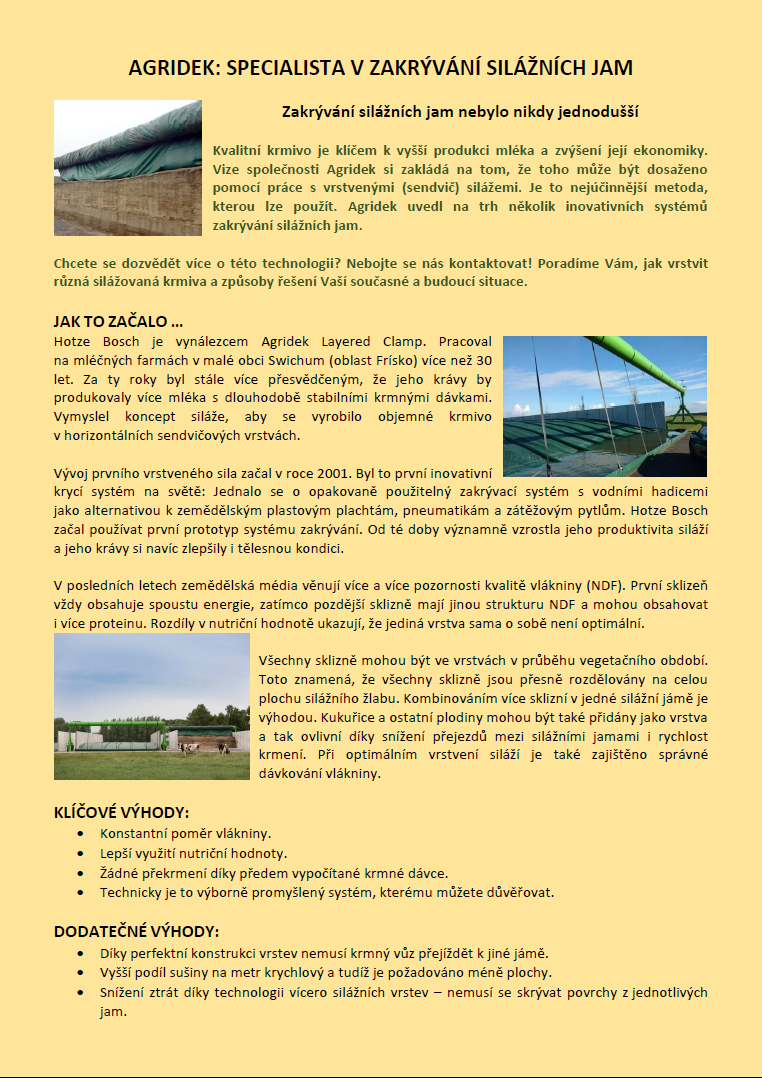 Kvalitní krmivo je klíčem k vyšší produkci mléka a zvýšení její ekonomiky. Vize společnosti Agridek si zakládá na tom, že toho může být dosaženo pomocí práce s vrstvenými (sendvič) silážemi. Je to nejúčinnější metoda, kterou lze použít. Agridek uvedl na trh několik inovativních systémů zakrývání silážních jam.